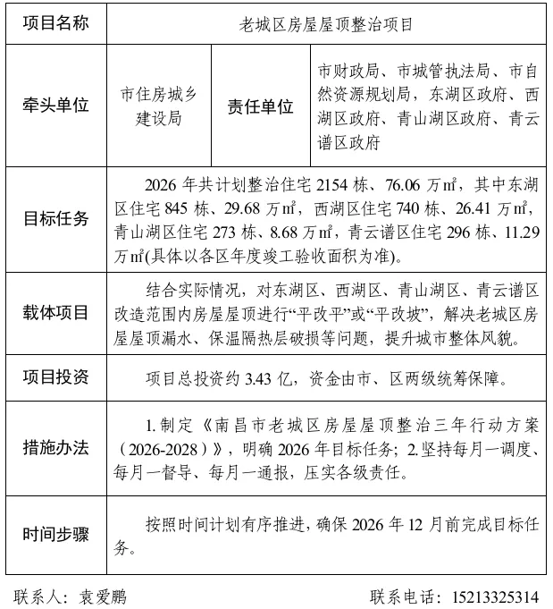 任务目标:推进老城区房屋屋顶整治工作,改善群众居住环境,提升城市整体风貌。2026年共计划整治住宅2154栋、76.06万㎡,其中东湖区住宅845栋、29.68万㎡,西湖区住宅740栋、26.41万㎡,青山湖区住宅273栋、8.68万㎡,青云谱区住宅296栋、11.29万㎡。