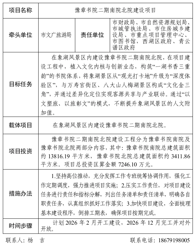 任务目标:在象湖风景区内建设豫章书院二期南院北院,在项目建设工程中,植入文化内核与创新业态,构筑“一湖书香三重韵”的书院体系,将象湖景区从“观光打卡地”升级为“深度体验区”,与万寿宫街区、八大山人梅湖景区构成“文化金三角”,并通过差异化定位实现客源共享与产业联动。通过“以文塑旅、以旅彰文”的模式,不断提升象湖风景区的人文附加值。