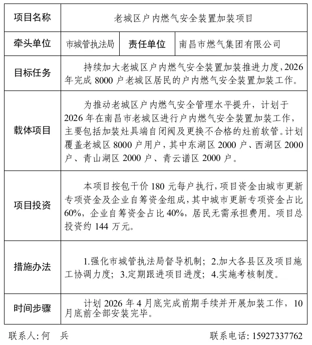任务目标:持续加大老城区户内燃气安全装置加装推进力度,为推动老城区户内燃气安全管理水平提升,2026年完成8000户老城区居民户内燃气安全装置加装工作,主要包括加装灶具端自闭阀及更换不合格的灶前软管。计划覆盖老城区8000户用户,其中:东湖区2000户、西湖区2000户、青山湖区2000户、青云谱区2000户。