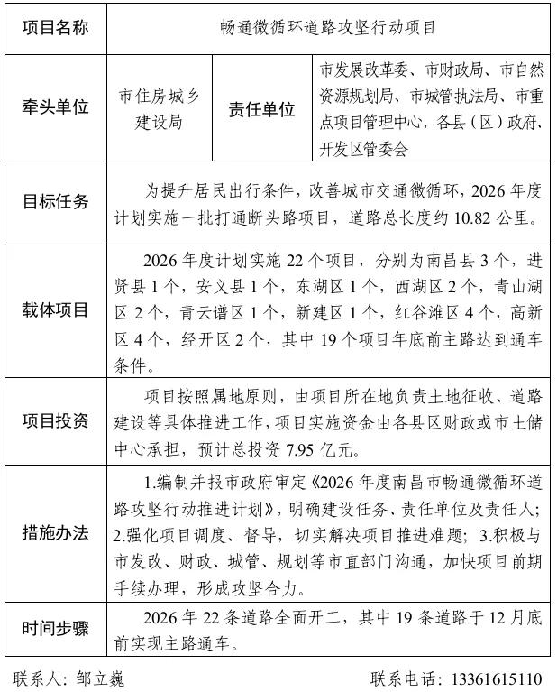 任务目标:为提升居民出行条件,改善城市交通微循环,2026年度计划在各县(区)、开发区实施22个畅通微循环项目,道路总长度约10.82公里。分别为南昌县3个,进贤县1个,安义县1个,东湖区1个,西湖区2个,青山湖区2个,青云谱区1个,新建区1个,红谷滩区4个,高新区4个,经开区2个;其中19个项目年底前主路达到通车条件。