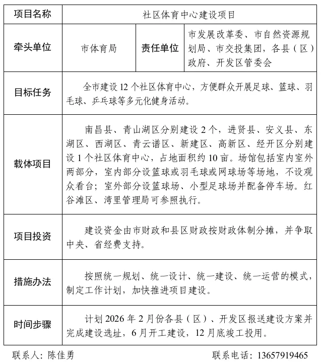 任务目标:在全市范围内建设12个社区体育中心,方便群众开展足球、篮球、羽毛球、乒乓球等多元化健身活动。其中:南昌县、青山湖区分别建设2个,进贤县、安义县、东湖区、西湖区、青云谱区、新建区、高新区、经开区分别建设1个社区体育中心,占地面积约10亩。场馆包括室内室外两部分,室内部分设篮球或羽毛球或网球场等场地,不设观众看台;室外部分设篮球场、小型足球场并配备停车场。红谷滩区、湾里管理局可参照执行。