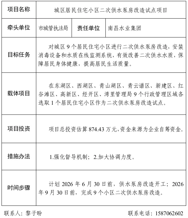 任务目标:对城区9个居民住宅小区进行二次供水泵房改造,安装消毒设备和水质在线监测系统,有效改善二次供水水质,保障居民身体健康,提高居民生活质量。其中:东湖区、西湖区、青山湖区、青云谱区、新建区、红谷滩区、高新区、经开区、湾里管理局9个行政管理区域各选取1个居民住宅小区作为二次供水泵房改造试点。
