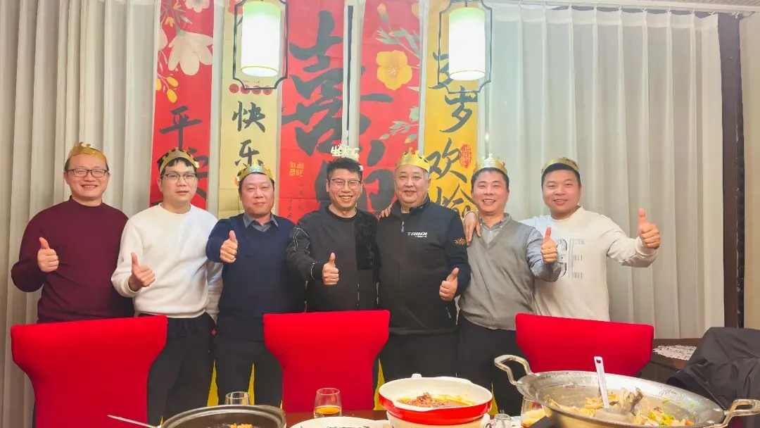 生日会现场张灯结彩,“平安喜乐”“岁岁欢愉”的喜庆布景暖意融融,精致的生日帽、飘香的家乡风味佳肴,将氛围感拉满。八位寿星并肩而立,脸上洋溢着幸福的笑容,一同竖起大拇指,既是为彼此的生辰送上祝福,也是为商会的蓬勃发展、为乡贤间的深厚情谊点赞。