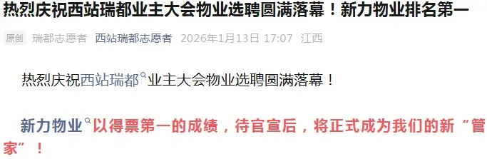 近日,南昌九龙湖西站瑞都小区的3561户业主,经历了一场堪比“悬疑剧”的物业选聘风波——江西本土龙头物业新力,以71.13%的得票率(2533票)拿下第一,却在业主满心期待时突然弃标。