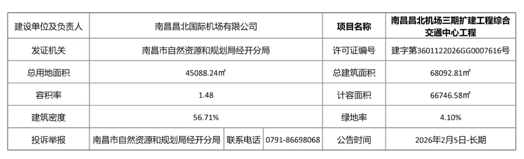 目前,南昌昌北机场三期扩建工程综合交通中心工程(GTC)批后公布正式出炉。建设单位为南昌昌北国际机场有限公司;许可证编号为建字第3601122026GG0007616号。