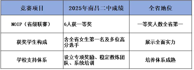 2025年全国青少年信息学奥林匹克联赛成绩公布,南昌二中以 6人获得省级一等奖 的优异成绩,位列江西省第一。这份成绩单背后,是学校连续多年的系统性竞赛培养体系,获奖学生分数远超136分的省一等奖分数线,其中高一学生陈聆心更是斩获全省女生第一名。