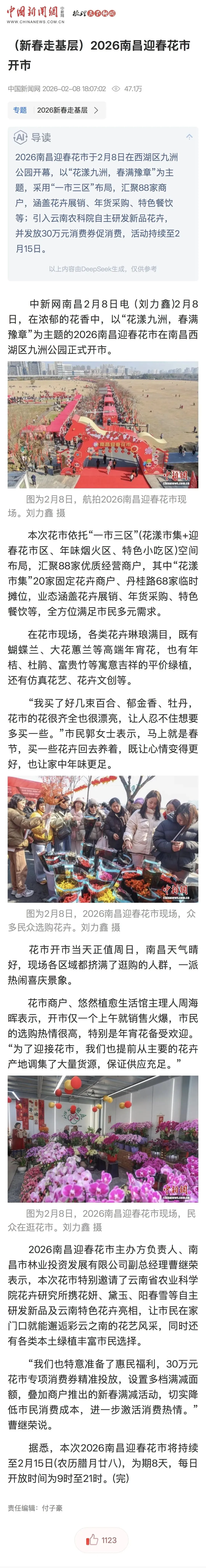 2月8日,以“花漾九洲,春满豫章”为主题的2026南昌迎春花市在南昌市西湖区九洲公园正式启幕。作为南昌新春文旅消费重点活动、市民精神文化生活重要载体,本次花市依托“一市(花漾市集)三区(迎春花市区、年味烟火区、特色小吃区)”空间布局,打造“赏花购花+文化沉浸+便民消费”一站式新春盛宴。开市当日,累计接待市民游客15万人次,以浓郁花香与醇厚年味,为英雄城新春消费市场注入强劲动能。