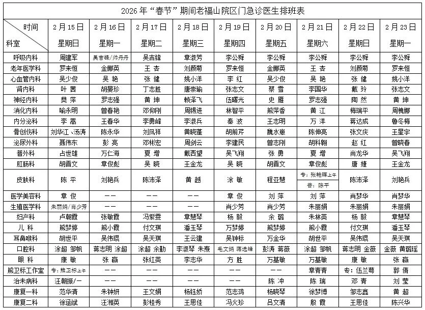 医技科室:TCD室(2月15日上午、2月23日上午)、胃镜室(2月16日上午、2月20日上午)正常运行,其余医技科室(医学检验科、医学影像科、超声医学科)每日正常运行。