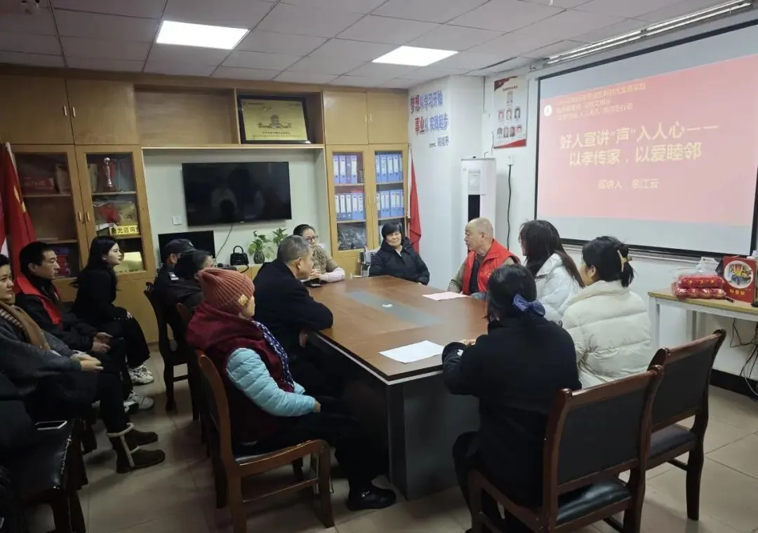 2月5日,西湖区邀请“南昌好人”余江云走进社区,在桃花街道龙河社区新时代文明实践站开展“好人宣讲‘声’入人心——以孝传家,以爱睦邻”主题宣讲活动,与辖区居民面对面分享孝老爱亲、邻里互助的感人故事。