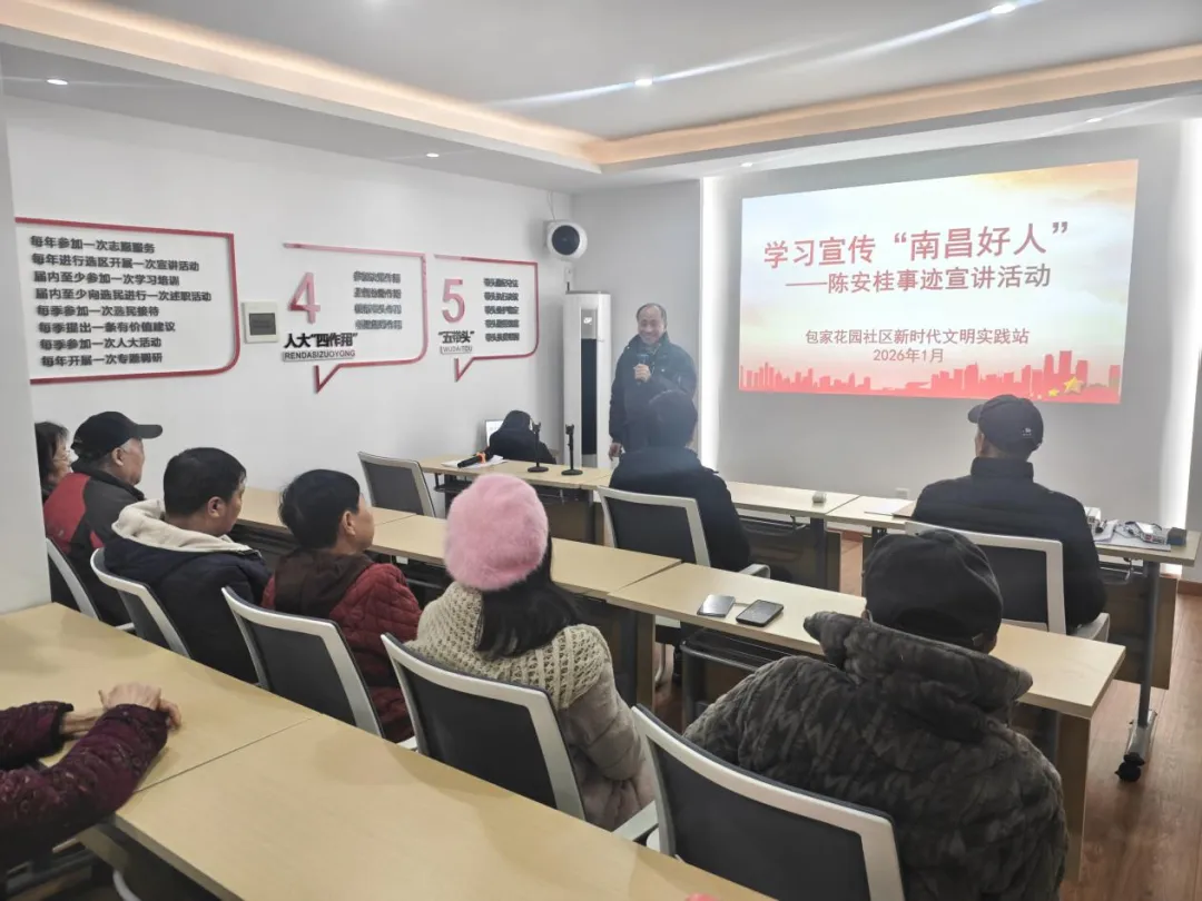 1月24日,三家店街道包家花园社区新时代文明实践站举办“南昌好人”先进事迹宣讲活动,社区党员、居民代表、志愿者等40余人参与,共学榜样事迹,共悟初心力量。