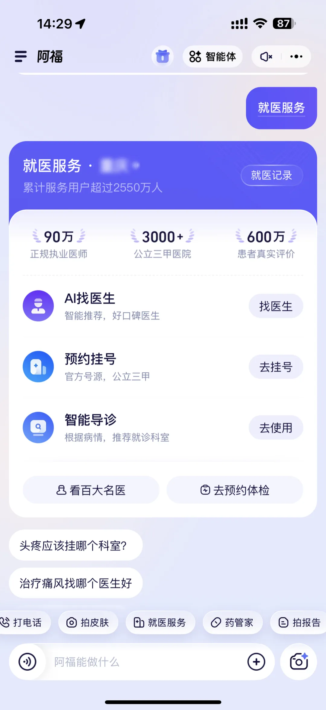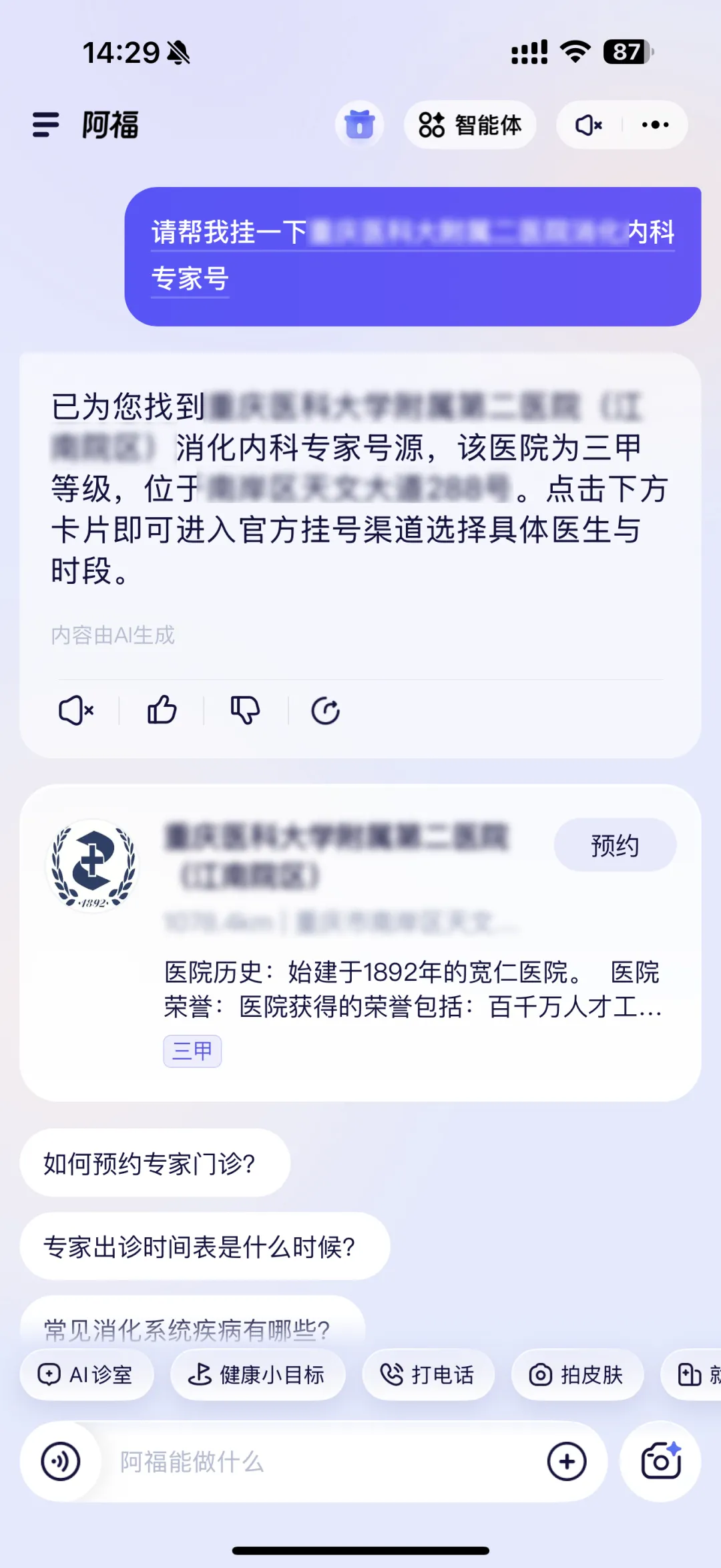 阿福真是十分推荐给父母装的一个AI。父母需要的就是健康,阿福合作的是各地医保局、卫健委,能直连全国大医院和专家,官方靠谱。真生病了让阿福协助挂个号、在线问医生,也很方便。