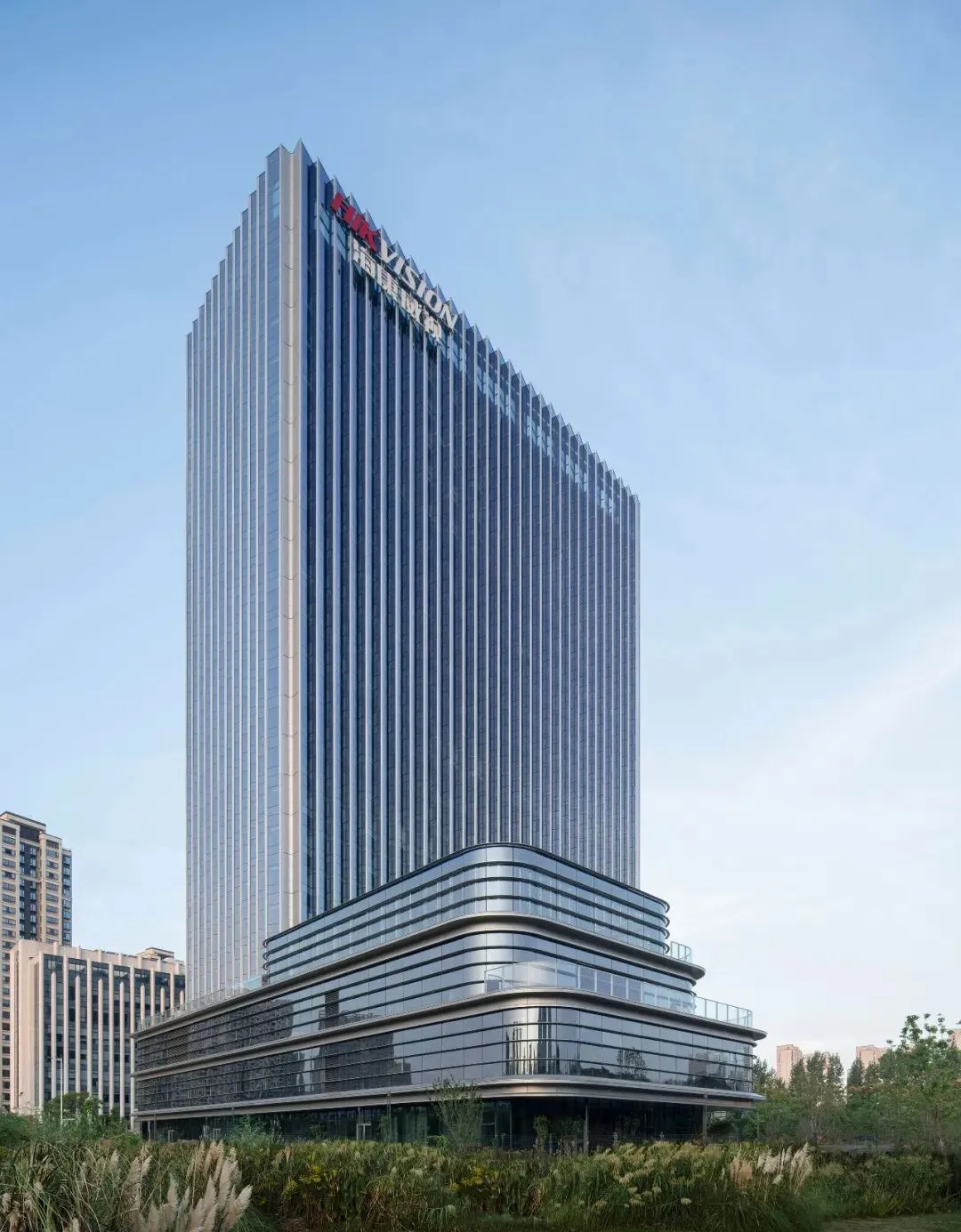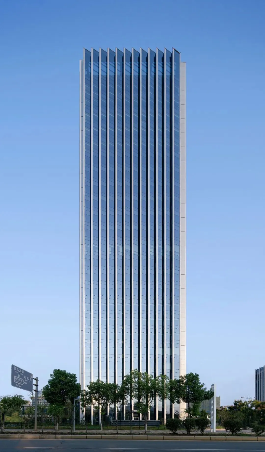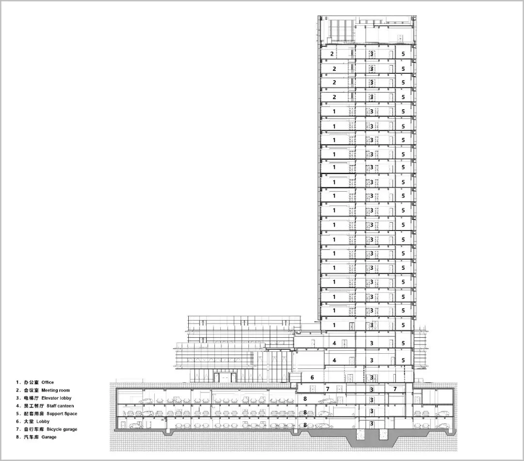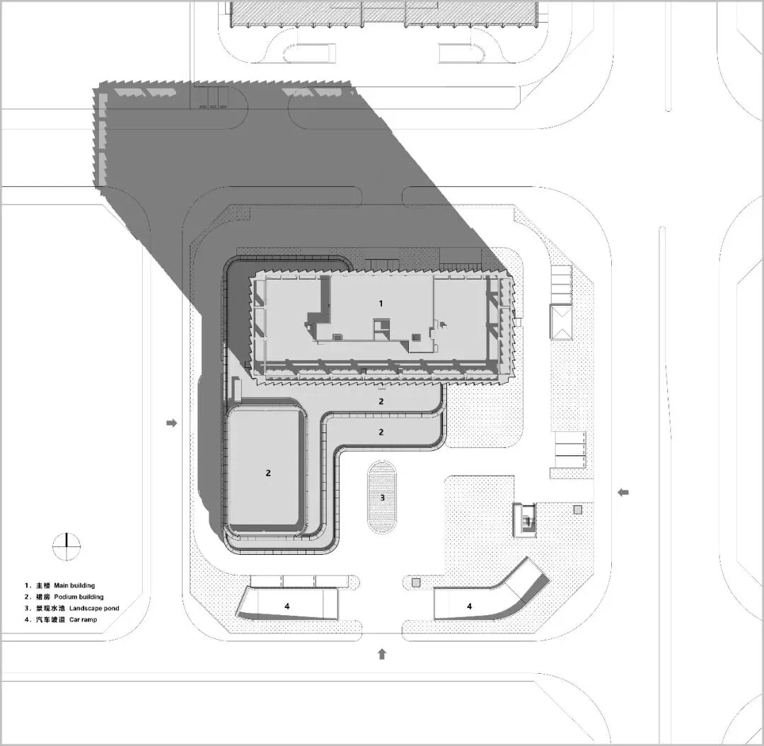立面设计是建筑的无声语言。主塔楼纵向的线条强化了形体的挺拔与稳重,与之咬合的裙房,则通过横向的肌理形成对话与对比。这一纵一横间,勾勒出理性、高效又不失动态的现代科技企业形象。