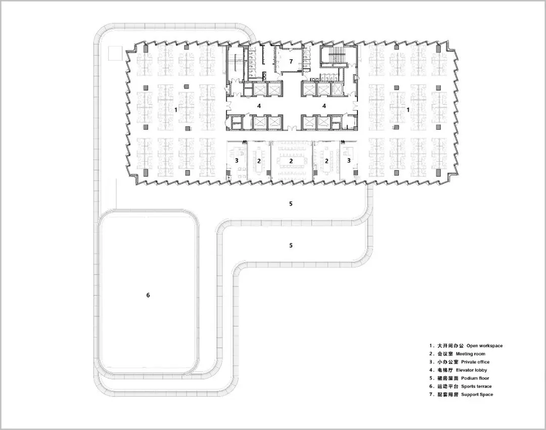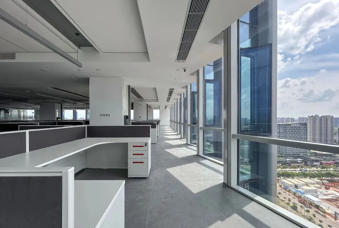 对于一家科技企业而言,人才是核心。设计团队深入洞察高效办公与人文关怀的需求,塔楼采用“薄板式”布局,将核心交通与公共服务置于中部,从而在两侧释放出完整、连续的超大尺度办公空间。这种布局让自然光与通风自由穿透,无论身处何处,都能享受明亮、健康的工作环境。