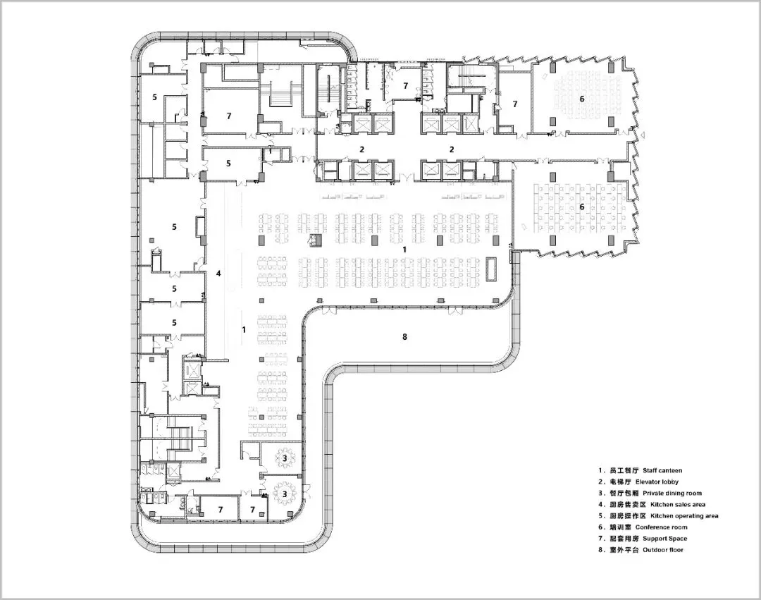 面向景观的员工餐厅,通透明亮,更延伸出宽敞的户外露台。这里不仅是就餐之所,更是灵感碰撞、休闲交流的活力发生器,让工作与生活达成美妙的平衡。