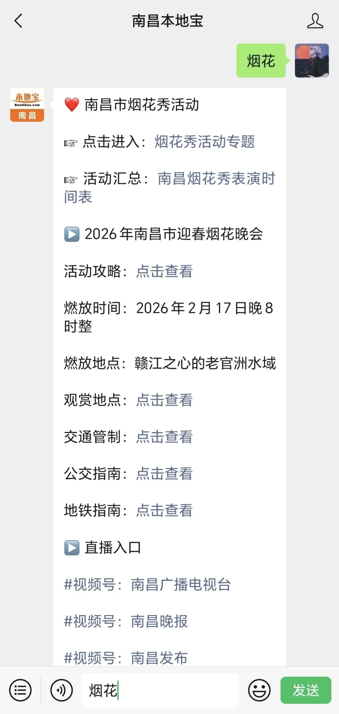 南昌本地宝推出非常多的功能,进入【南昌本地宝】公众号聊天对话框里,点击发消息,在对话框内输入并发送对应的【关键词】即可获取相关内容。
