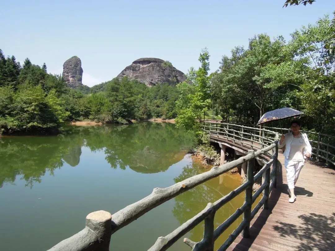夜宿小镇且逡行,日悔步行路远深。移步换景栈道险,丹霞貌奇鬼神工。象鼻才垂龙头起,老龟爬行石虎蹲。最是阴阳石天造,象征繁衍昭人伦。