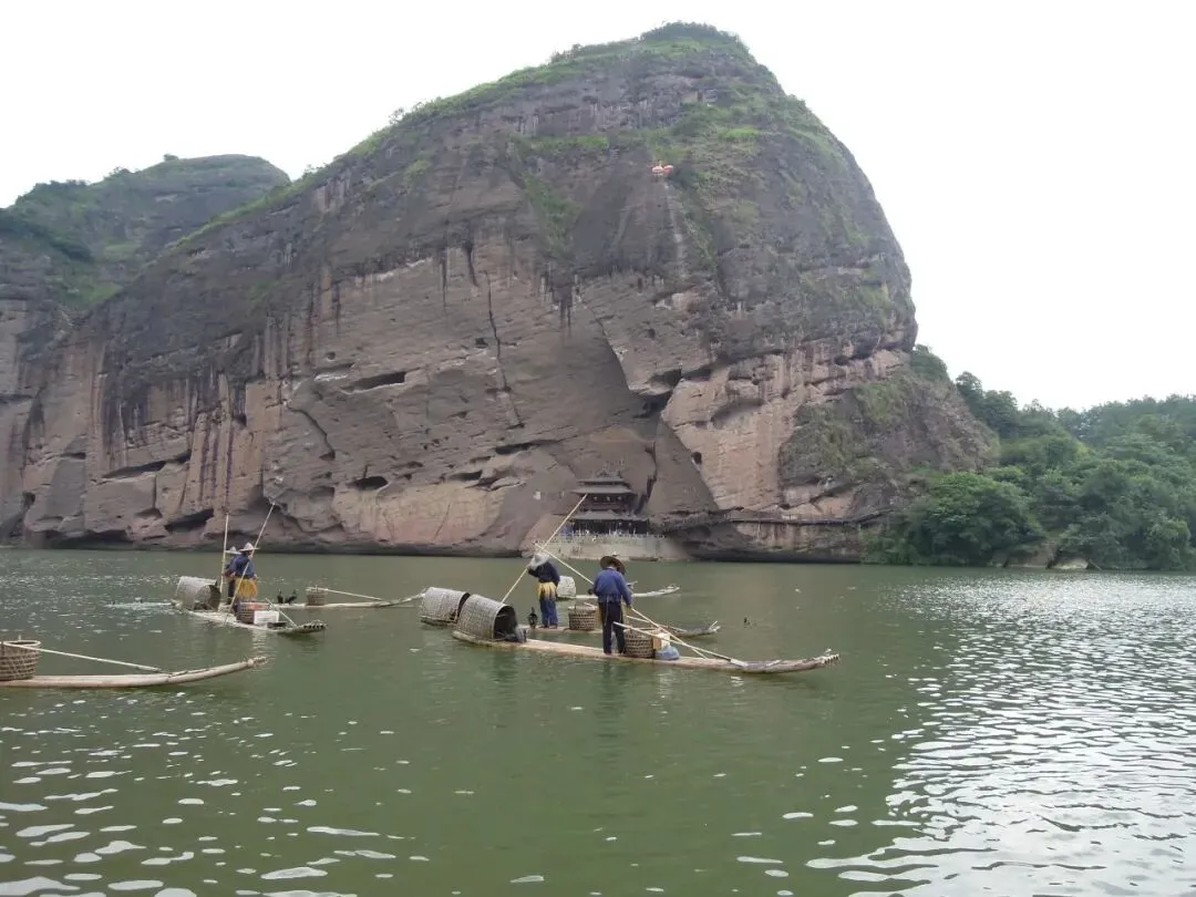 竹排撑出芦溪河,两岸奇峰秀几重。千年悬棺存谜问,悬葬表演助游兴。无蚊村上蚊哪去?河风吹拂樟香浓。山中宰相谁封号,天师府第道高称。