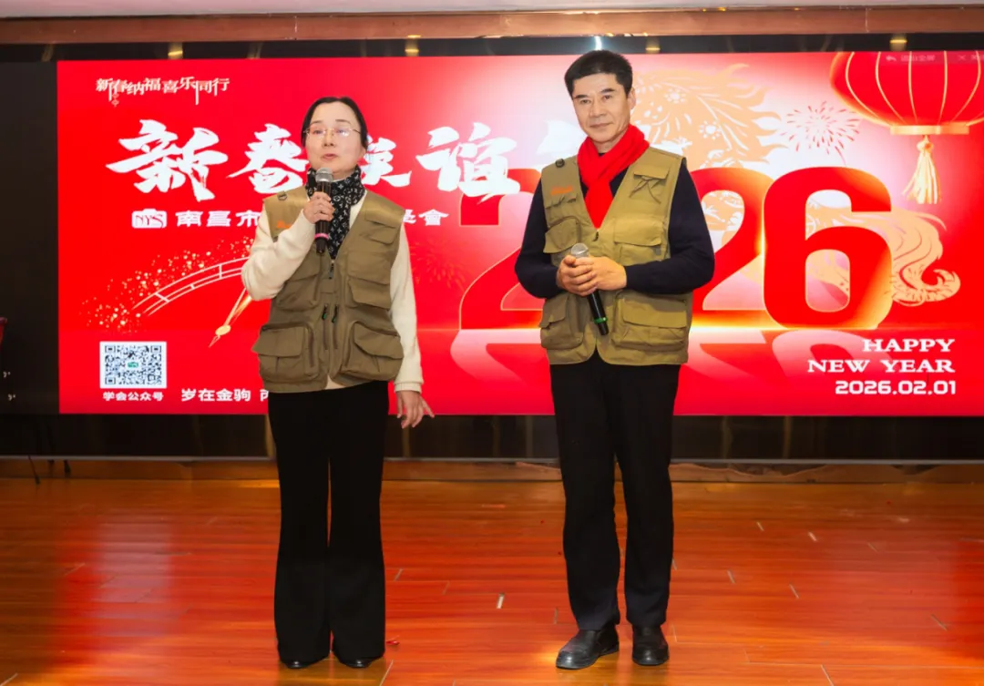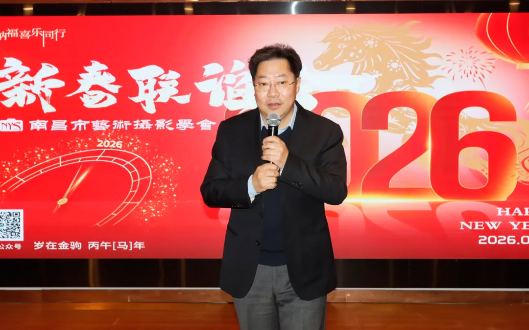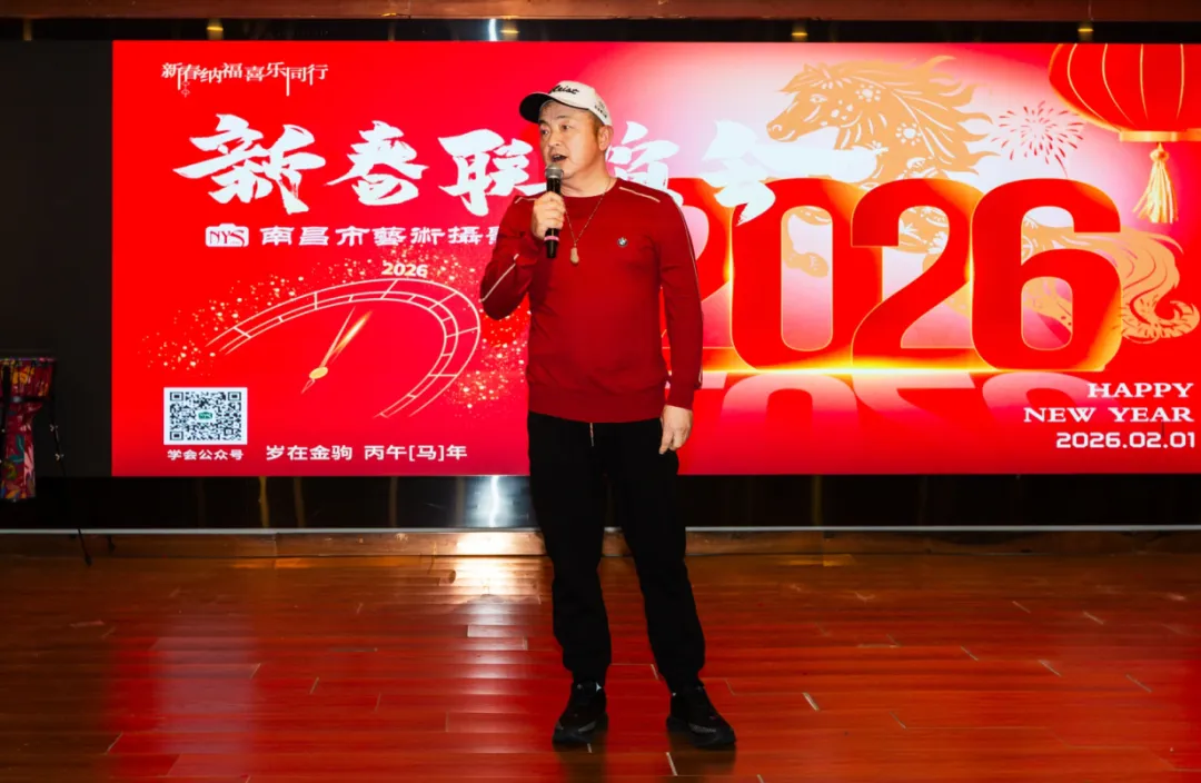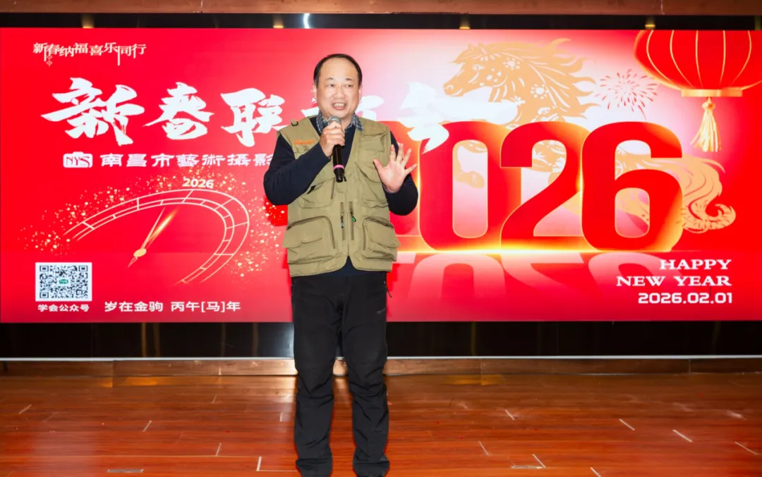 2月1日江西师大瑶湖校区白鹿会馆银杉厅内张灯结彩,巨大的LED屏上“南昌市艺术摄影学会·2026年新春联谊会”字样熠熠闪光。