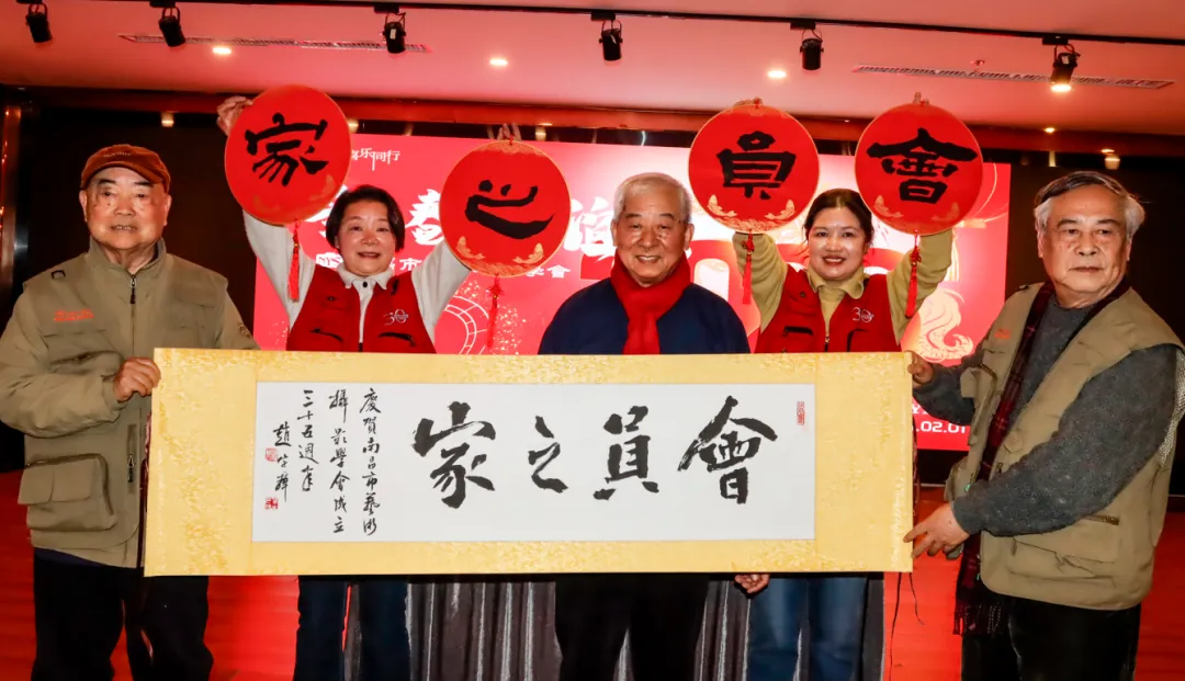墨宝《会员之家》,是原南昌市书法家协会主席、著名书法家赵定群先生(中立者)给予全体会员的祝福。(接匾者:左/副会长曹锋老师,右/副会长饶良平老师,持灯笼者:左/副秘书长黄娟、右/会员邵惠清)