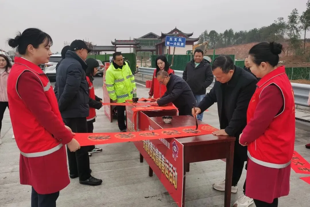 在贵溪收费站,一场别开生面的“情暖春运”小年送春联活动在此展开。收费站特邀余干县书法家协会的书法家们现场挥毫,笔走龙蛇间,“福”字饱满,寓意吉祥。一句句美好的祝愿化作一幅幅火红的对联,温暖着途经的司乘。“没想到在收费站还能收到手写的春联,太有心意了!”返乡司机王师傅的喜悦之情溢于言表。