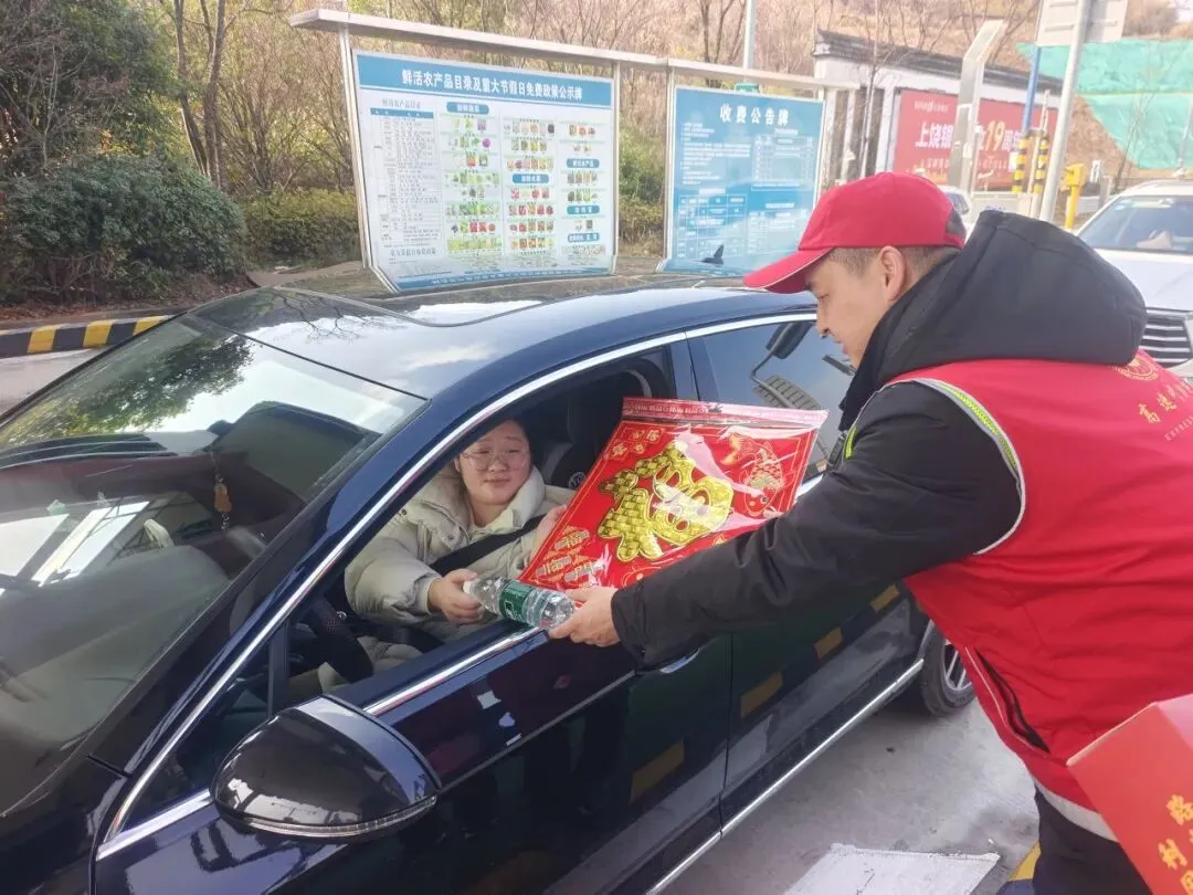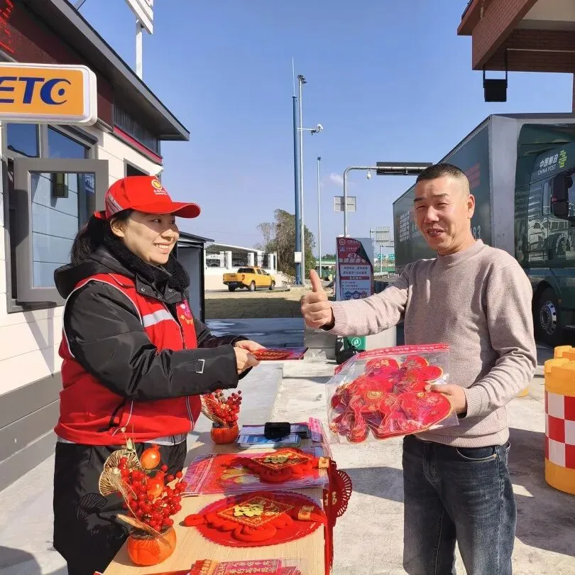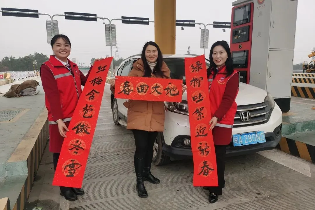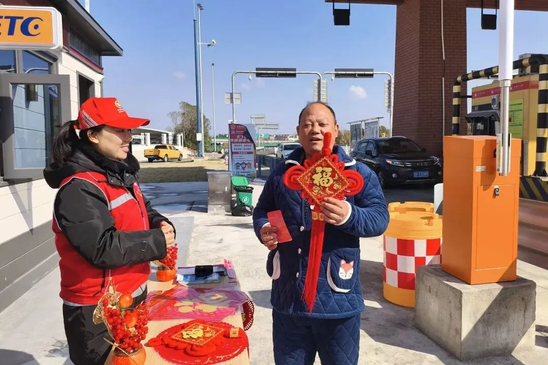 丽村收费站的工作人员化身“福运使者”,在收费广场将新春礼品逐一送到司乘手中,同步送上“马到成功、一路平安”的诚挚问候,并辅以热水、路线咨询、安全提醒等便民服务。樟树东收费站的“香樟树”班组用火红的春联和温暖的笑容,让收费站洋溢着喜庆祥和的节日氛围。