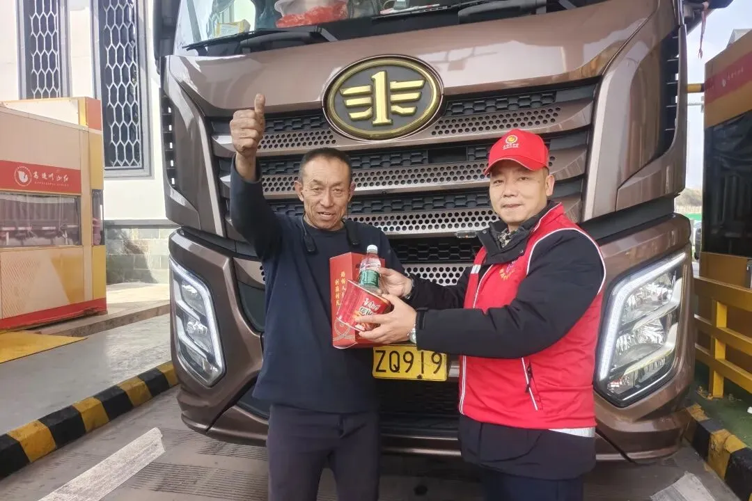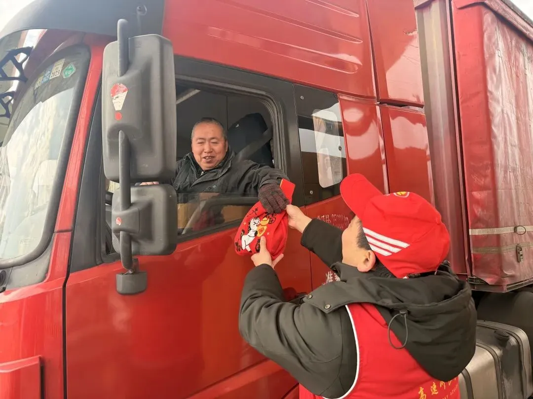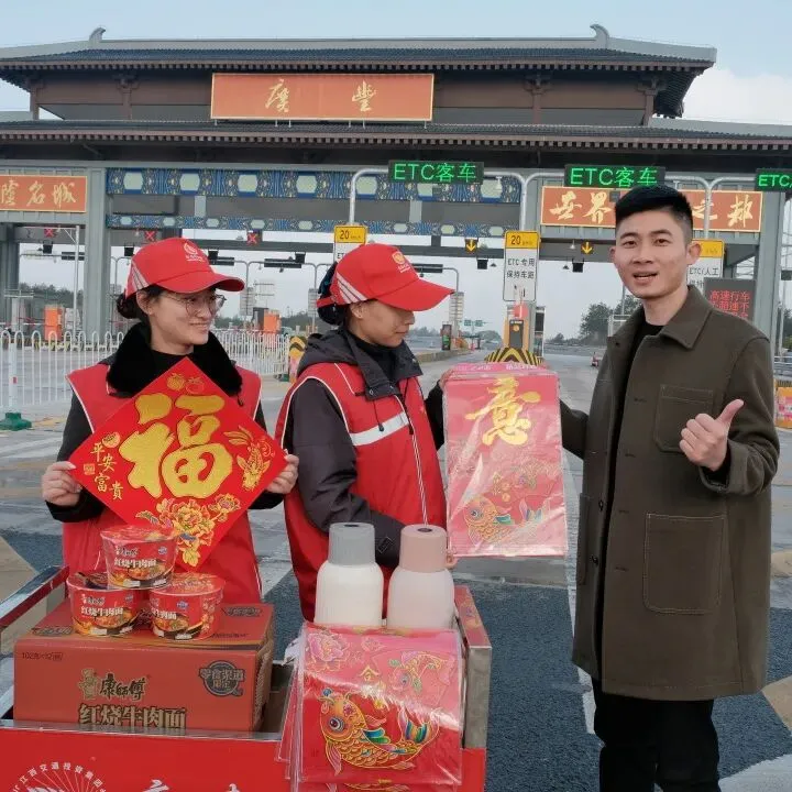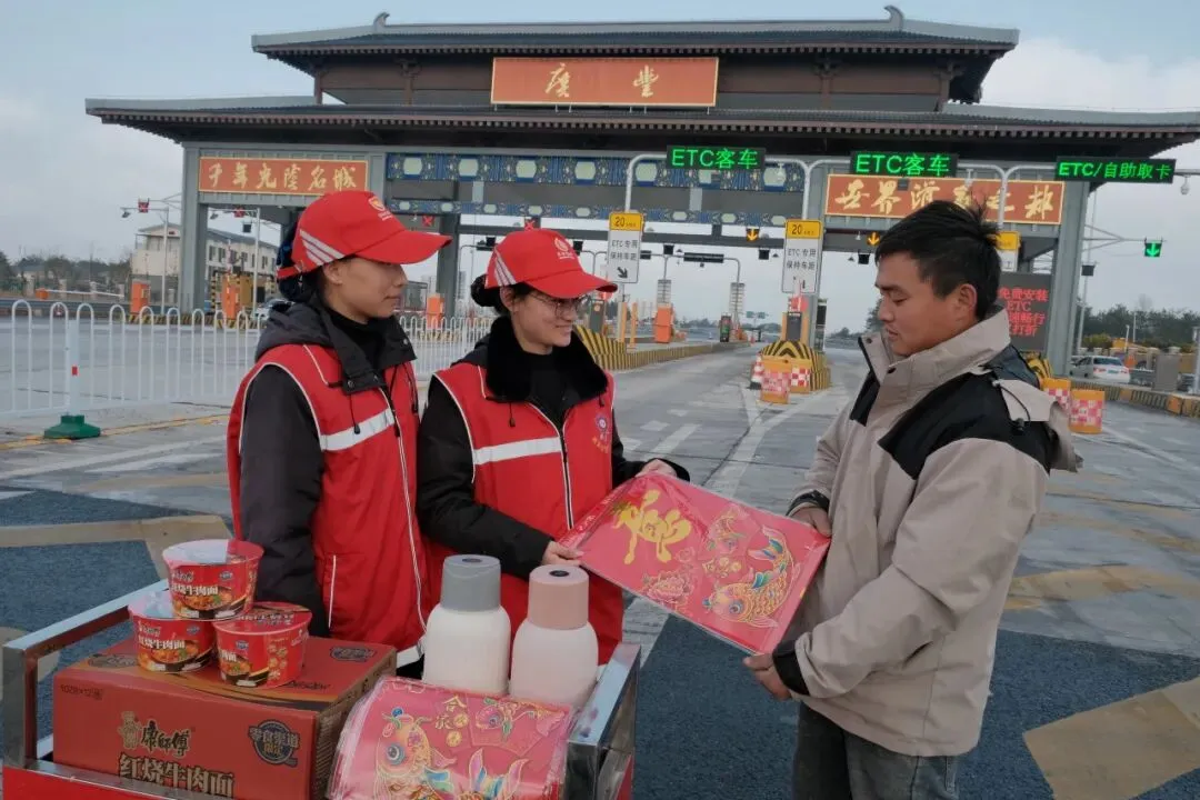 广丰收费站工作人员主动为司乘递上热水、泡面和新春对联,以朴实而温馨的方式提前送上节日问候,让奔波在春运路上的人们感受到温暖与安心。