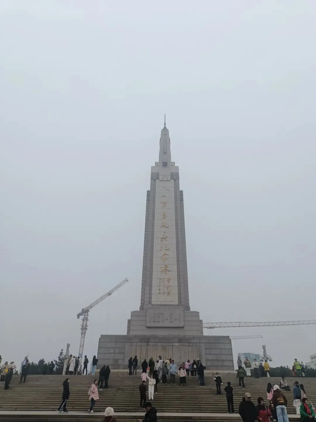 此时,空中突然洒落起小雨,似乎诉说着南昌起义的腥风血雨。我们冒着小雨参观纪念塔。塔为长方体,高53.6米,由塔基、塔座、塔身、塔顶四部分组成。塔座正面镌刻“八一南昌起义简介”碑文东、南、西三面各有一幅反映武装起义的人物浮雕。塔身正面为“八一南昌起义纪念塔”铜胎鎏金大字。塔顶由一支直立的巨型“汉阳造”步枪和一面八一军旗组成。我们环塔座走一圈,心情无比沉重。随后,我们在广场踱步。