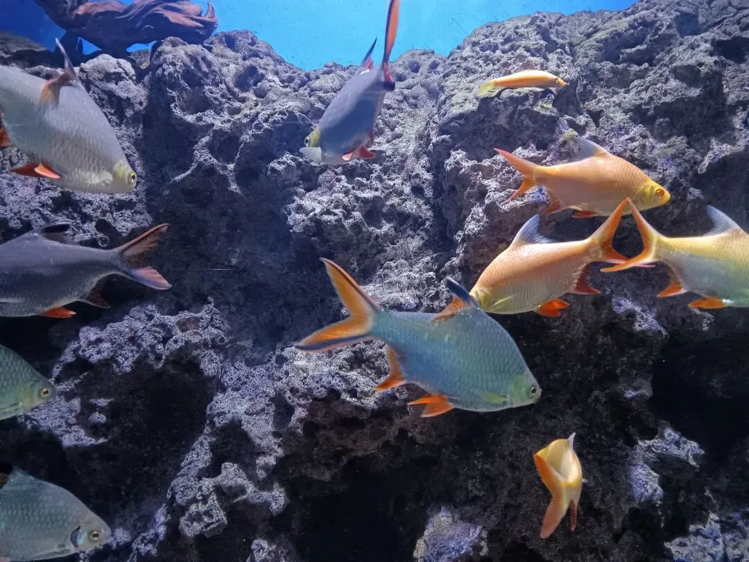 10点半,我们走进“海世界”。远远看去,巨大的建筑群形似碗、盆和瓶的组合,外观是瓷器装饰风格,暗合江西瓷器之乡地域特色。据妹夫讲,此项目原由万达投资,后由融创接手,开放已达10年之久。一进入“海世界”,我们几乎走进了一个完全陌生的世界,各种五颜六色的海洋生物游弋在眼前。它们在自由游动,摇头摆尾,或沉或浮,吐着水泡,眩丽夺目,瞬间我的眼睛睁大睁圆,脚步几乎粘在地板上。对于游客的到来,他们热情大方,似在频频“招手”。在热带海洋馆,我们看到:海豚、海狮、鲨鱼、小丑鱼、水母、瑶鱼、金枪鱼、舌鱼、海龟、海蟹、龙鱼………在热带雨林馆,我们看到各类蜘蛛、蛇、蜥蜴、蝴蝶(标本)、昆虫……这一切,让我们见识了地球生物的多样性。