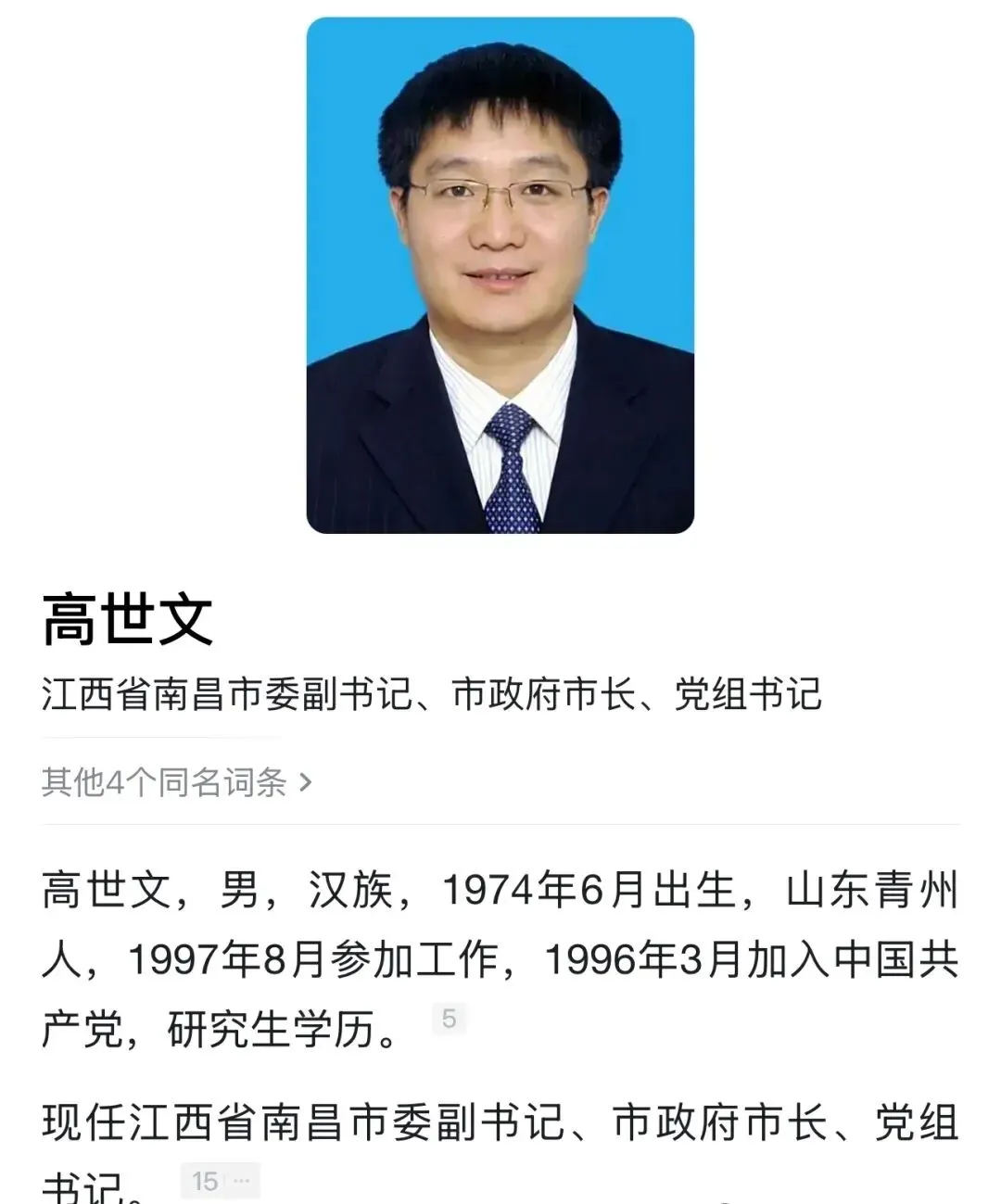 高世文,男,汉族,1974年6月出生,山东青州人,1997年8月参加工作,1996年3月加入中国共产党,研究生学历。现任江西省南昌市委副书记、市政府市长、党组书记。