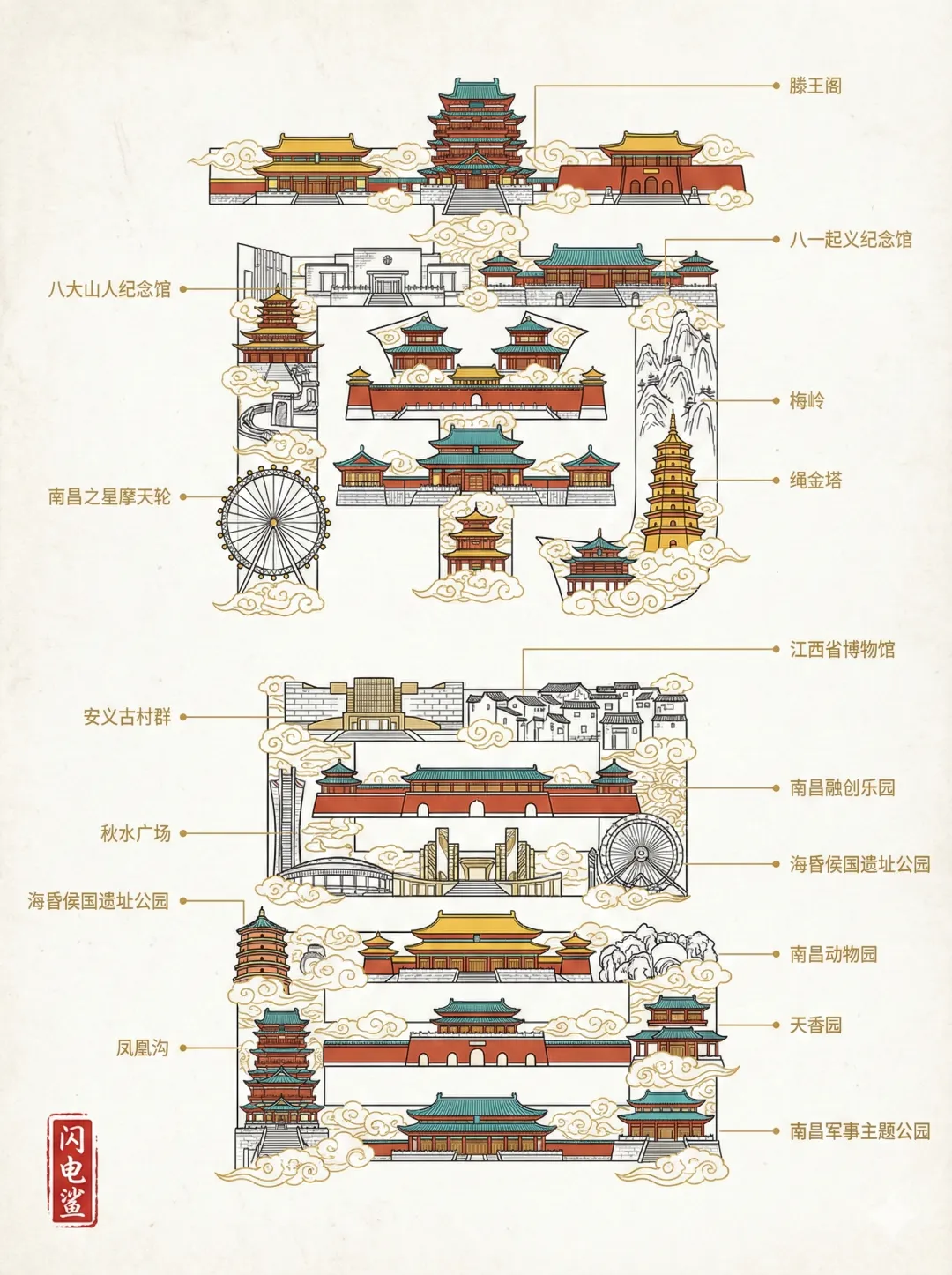 (图中景点:滕王阁、八一起义纪念馆、八大山人纪念馆、梅岭、绳金塔、南昌之星摩天轮、江西省博物馆、安义古村群、南昌融创乐园、秋水广场、海昏侯国遗址公园、南昌动物园、天香园、凤凰沟、南昌军事主题公园)