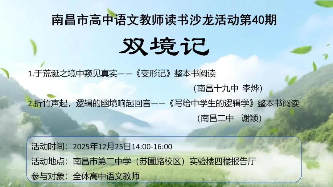岁聿云暮,书香暖冬。2025年12月25日下午,南昌市高中语文教师读书沙龙第40期活动在南昌二中苏圃路校区举办。来自全市各高中的语文教师齐聚一堂,以书为舟,以思为楫,共同开启了一场题为“双境记”的思想航行。