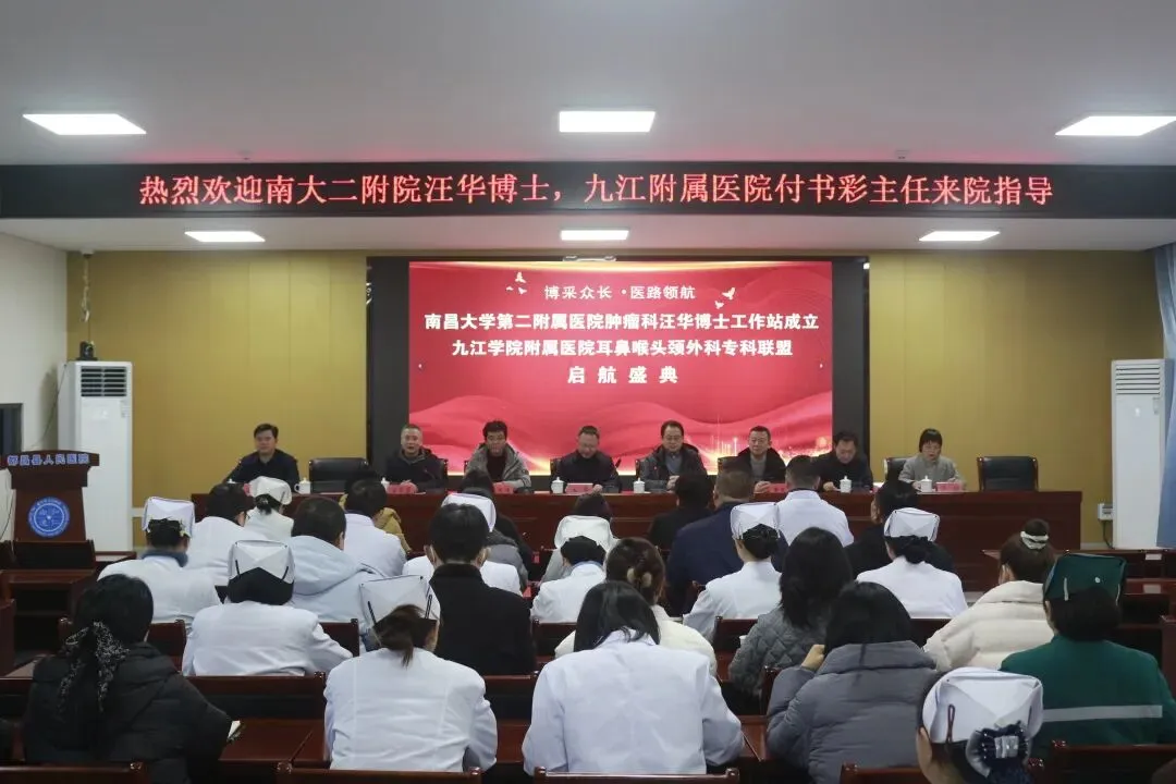 腊尽春回,万象更新。2月10日,南昌大学第二附属医院汪华博士工作站暨九江学院附属医院耳鼻咽喉头颈外科专科联盟启动仪式在都昌县人民医院院区六楼会议室隆重举行。南昌大学第二附属医院肿瘤科汪华博士、九江学院附属医院耳鼻喉头颈外科付书彩主任,都昌县卫健委工会主席段庆颂,都昌县人民医院院区院党委书记黄友国、院长占志勇及医院班子成员、中层干部、临床骨干共计200余人参加仪式。