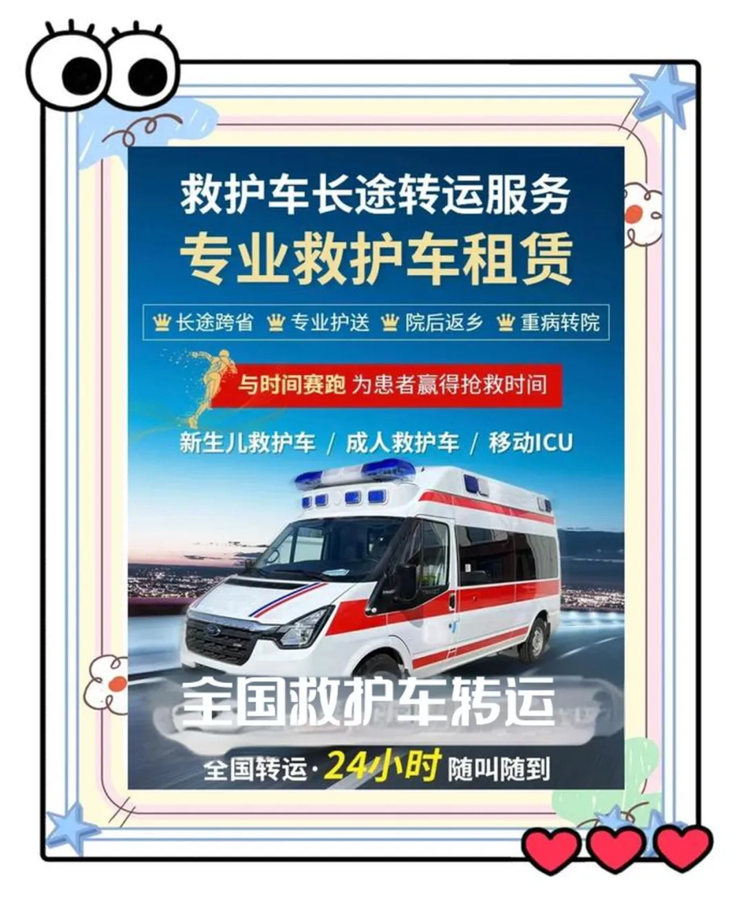 我们是正规的非急救转运公司,咱们主要是接一些长途跨省、救护车护送服务、出院转院的订单。如果您现在想找一个优惠救护车,那么不妨可以试一下我们。我们有专业的医疗转运团队,经验非常丰富。咱们不管是司机还是医生护士啊,都是非常专业的。