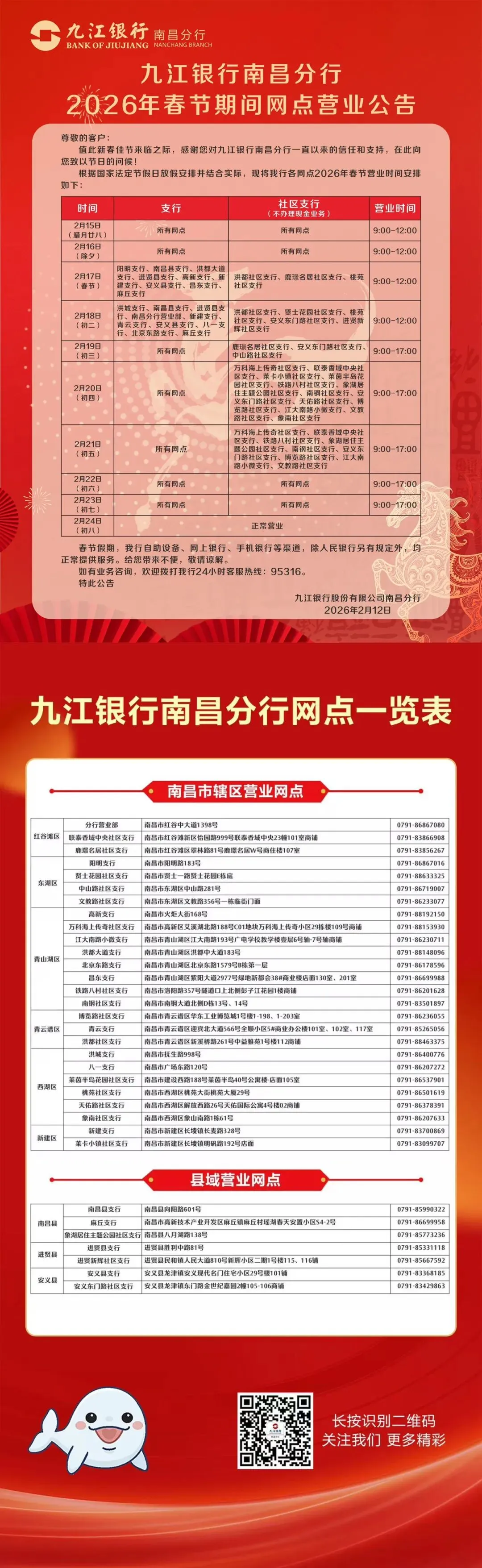 >九江银行南昌分行2026年春节期间网点营业时间公告