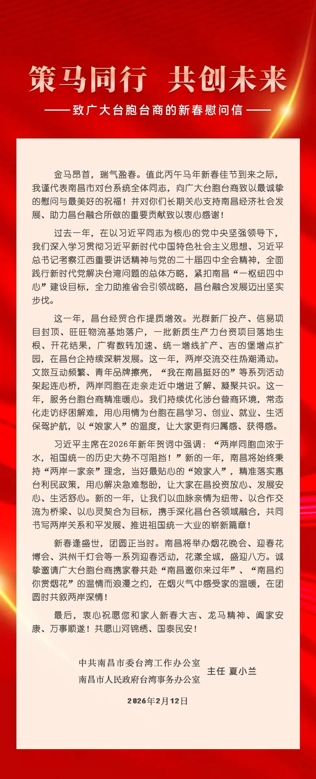 >南昌市台办主任夏小兰致广大台胞台商的新春慰问信