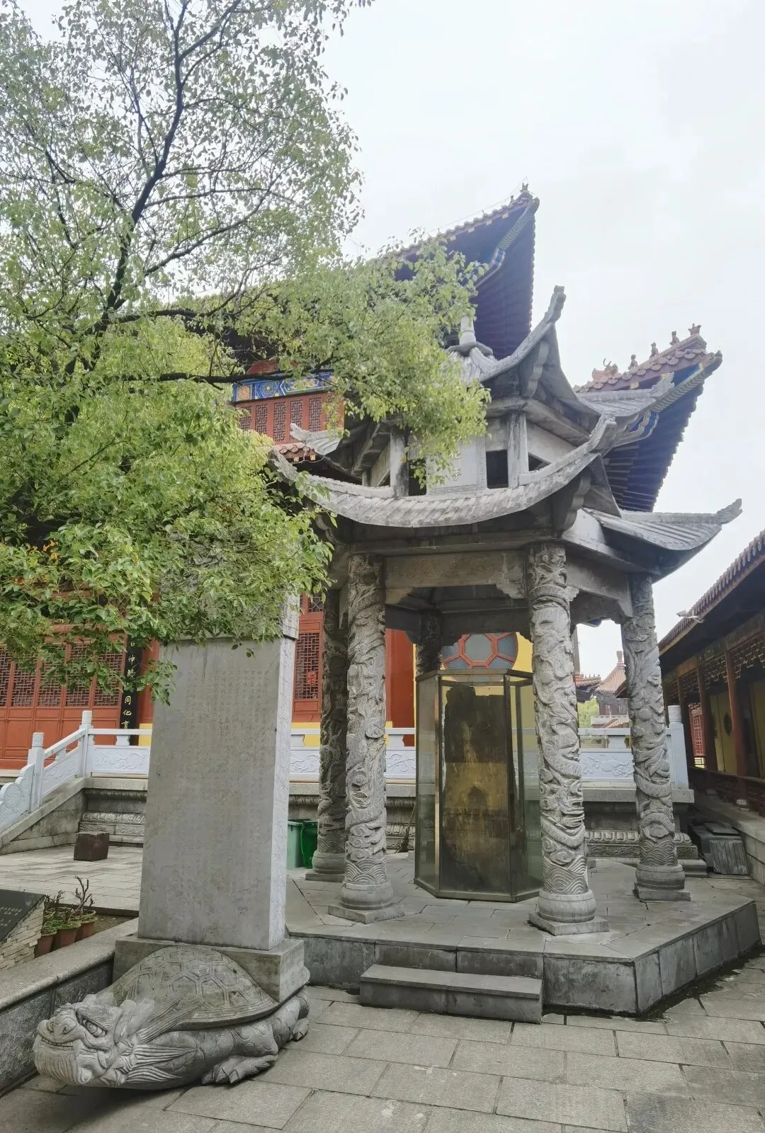 老君殿左前方玅化亭内,存放着镇宫之宝矽化木,长约二米、直径约60公分,是专程由新疆运来的。矽化木亦称“木化石”,由一亿多年前侏罹纪时代的古树,在地壳运动变迁中埋入地下,经密封,高温,含矽的地下水相互反应后形成的化石。相传其采天地之灵气,日月之精华,集金、木、水、火、土,五行于一体,有安宅镇土,禳灾解厄,避煞祛邪等功效,为稀世珍宝。