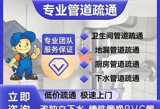 管道疏通:家用及大型疏通机处理各类疑难堵塞,专业疏通卫生间、地漏、浴缸、菜池、马桶等。