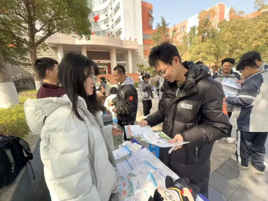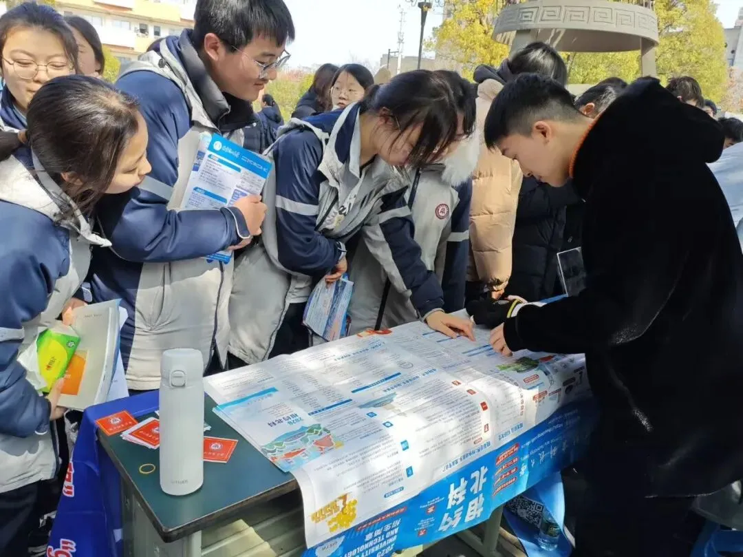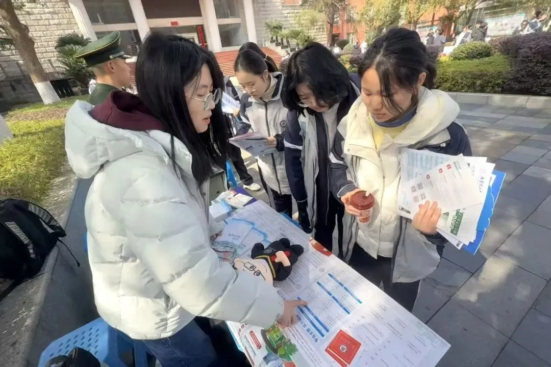 在摆摊咨询答疑环节,刘喆、童宇忻两位成员热情接待前来咨询的学弟学妹,围绕学校专业设置、报考流程与发展方向展开细致讲解,并结合不同同学的兴趣取向与学习情况,提供更具针对性和参考价值的建议,帮助大家更清晰地认识升学路径与未来选择。