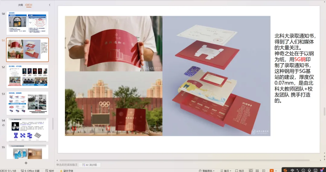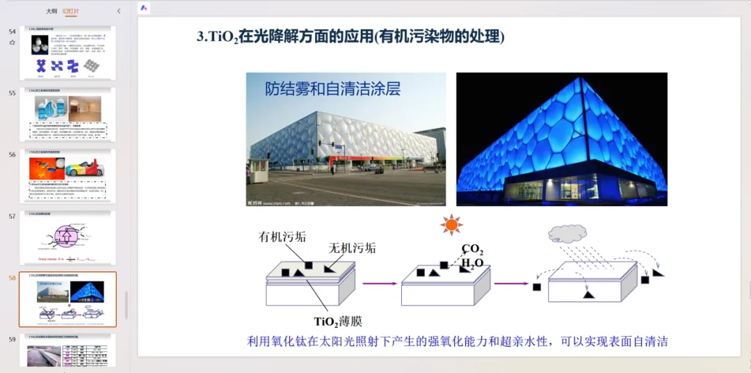 在材料知识小科普环节,刘喆同学在宣讲前精心准备材料小课堂,将材料导论课中学到的有趣知识融入分享之中,并从生活中的常见现象切入,引导学弟学妹走进材料科学的世界。通过生动的案例讲解,以水立方建筑表面所应用的二氧化钛材料为例,介绍其如何实现自清洁与自除雾等功能特性,让抽象的专业知识变得直观易懂,也让同学们感受到材料学科的魅力与趣味。