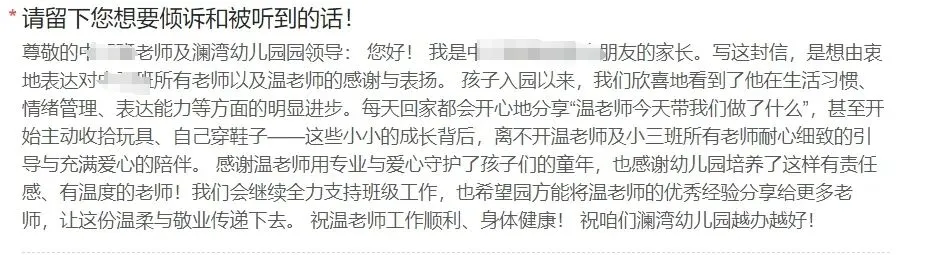一句句 “遇到你们是我们的幸运”“感谢你们的爱与陪伴”,朴实无华却饱含深情。这些认可,是对老师们践行 “教师是幼儿的倾听者、观察者、支持者与合作者” 角色的肯定,是对幼儿园 “成就儿童底色 共续教育力量” 教育宗旨的印证,更是对 “培养有感知力、关爱心、好奇心、合作力和创造力的未来儿童” 培养目标的期许。
