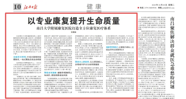 南昌大学附属康复医院作为一所集康复特色与综合学科于一体的高水平医院,在意识障碍促醒、老年吞咽障碍干预、儿童发育康复、脊柱侧弯矫治等多个领域实现技术突破与服务创新,构建起覆盖全人群、全周期的康复医疗体系。近年来,医院在康复医学领域多点突破,不仅填补了省内多项技术空白,更在全国乃至国际舞台发出了“江西声音”。“以患者为中心、以功能康复为目标”的理念,不仅改变了公众对康复医学的认知,更以专业技术与系统服务,为更多患者带来了重返家庭、回归社会的希望。《江西日报》专题报道了我院在康复医学领域的前沿探索与系统实践。