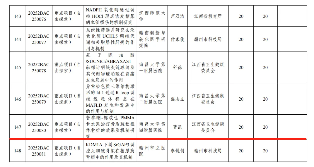 8月,江西省科学技术厅下发了《江西省科学技术厅关于 2025 年省级科技计划第二批项目和职业早期青年科技人才培养专项项目立项的通知》,曹凯教授申报的《苦参酮-锶改性 PMMA骨水泥治疗骨质疏松椎体骨折的效果及机制研究》成功获批江西省自然科学基金重点项目(自由探索)立项。该项目聚焦骨质疏松椎体骨折治疗领域,通过创新性地研究苦参酮-锶改性PMMA骨水泥的治疗效果及作用机制,有望为临床治疗提供新的思路和方法,其研究成果将对提升骨质疏松性骨折的治疗水平具有重要意义。
