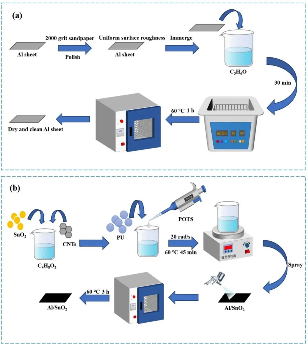 目前,现有的电子封装材料中有很多热导率差的材料。例如,常用的环氧树脂热导率较低,温度升高会缩短设备的半衰期。虽然铝的热导率极佳,但其高红外发射率使其容易被红外系统探测到。研究表明,通过特定的微纳结构设计或与其他功能材料复合,可以在保持基体金属优异热传导性能的同时实现红外隐身效果。二氧化锡(SnO2)是一种重要的宽带隙半导体材料,不仅因其可广泛调节的红外反射率而著称,还因其能够精确调节红外辐射输出而备受关注。其中,SnO2颗粒与金属铝之间的界面尤为重要,因为它既能消散设备产生的热量,又能对红外辐射进行强选择性吸收。近年来,纳米复合材料的出现使得设计多效材料成为可能,这些材料通过控制SnO2颗粒的形状、尺寸和空间排列来优化热导率和红外隐身性能。SnO2/Al复合材料的发展面临两大挑战。首要挑战是高界面热阻,这会降低系统的热传导效率;其次是材料在恶劣环境中的耐久性以及大规模生产中的困难也阻碍了其实际应用。因此,目前迫切需要一种材料策略,不仅要解决热-红外悖论,还要确保坚固性和可扩展性,以超越当前最先进系统的性能妥协和加工复杂性。为了减少界面热传导,将SnO2涂层施加于铝基底上形成叠加结构。随后通过表面微纳米结构化进一步增强所得复合材料的耐久性,旨在提高整体材料性能。这种方案有望在不影响红外隐身性能的情况下实现良好的热性能,有可能会降低界面热阻并进一步提高复合材料的耐久性。