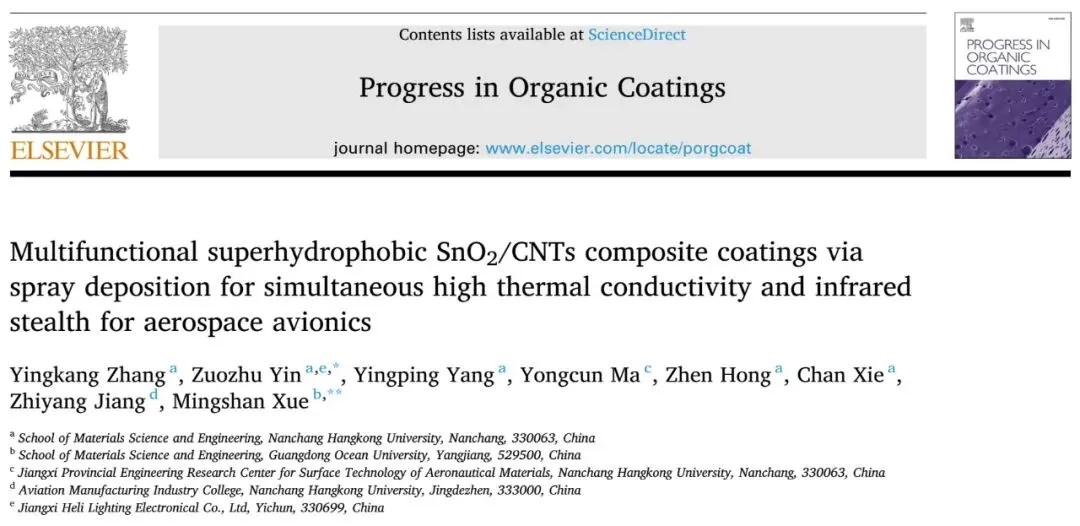 相关研究成果以“ Multifunctional superhydrophobic SnO2/CNTs composite coatings via spray deposition for simultaneous high thermal conductivity and infrared stealth for aerospace avionics”为标题发表在《Progress in Organic Coatings》上。