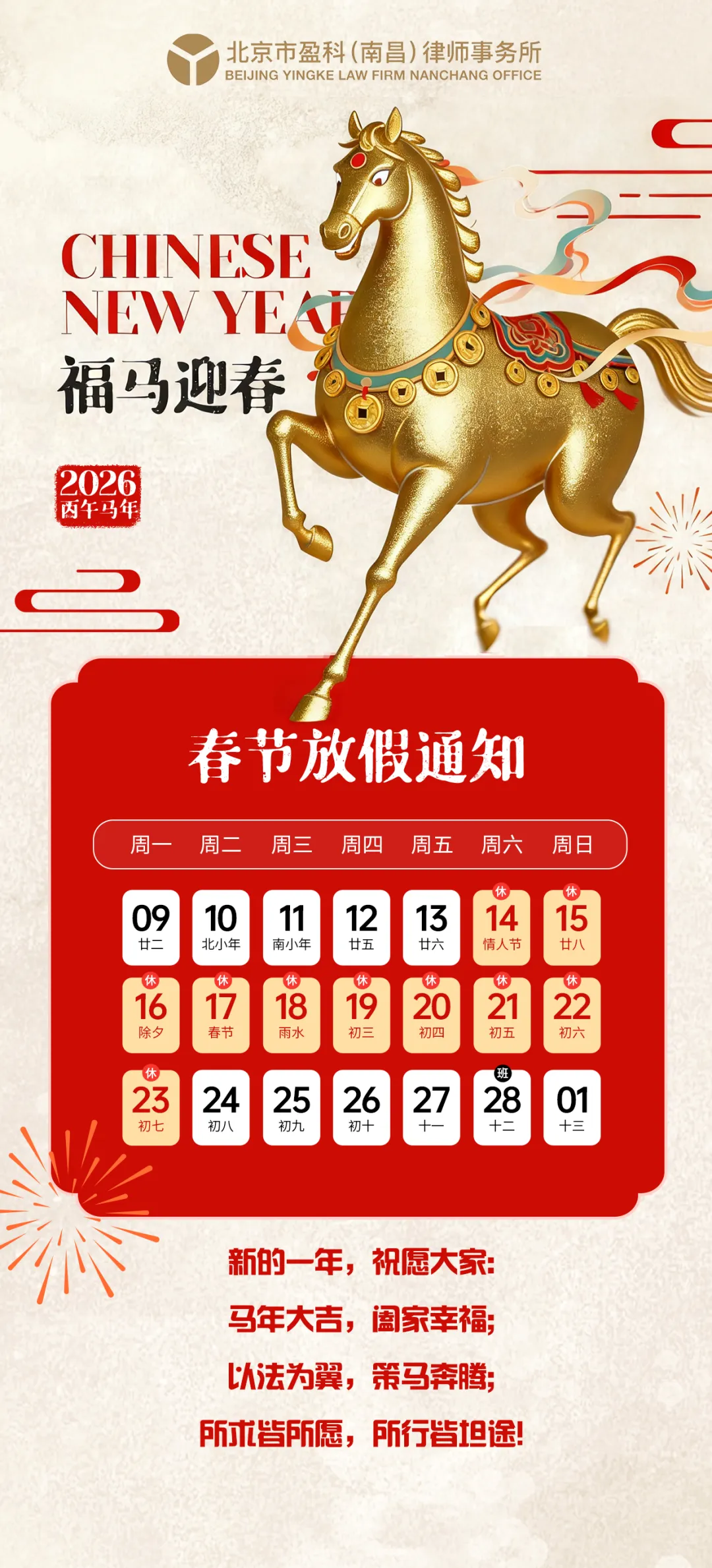>金蛇辞旧岁 福马迎新春丨盈科南昌2026春节放假通知