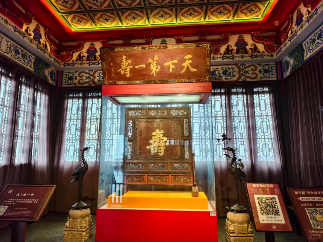 滕王阁的第五层是“纵览厅”,此层是滕王阁最高的明层。这里藏着一对“福寿CP”,过年必须一起拿下!在北侧“祈寿厅”,有“天下第一寿”插屏式座屏风。这可是光绪皇帝的御笔,由状元曹鸿勋恭立,末代帝师朱益藩题匾,排面直接拉满。