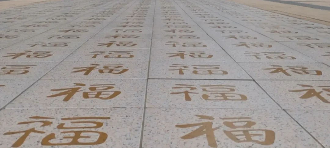 由一千块刻着“福”字的地砖,铺成一片福字海洋。篆书、隶书、楷书、行草……各体皆有,没有两块一模一样!