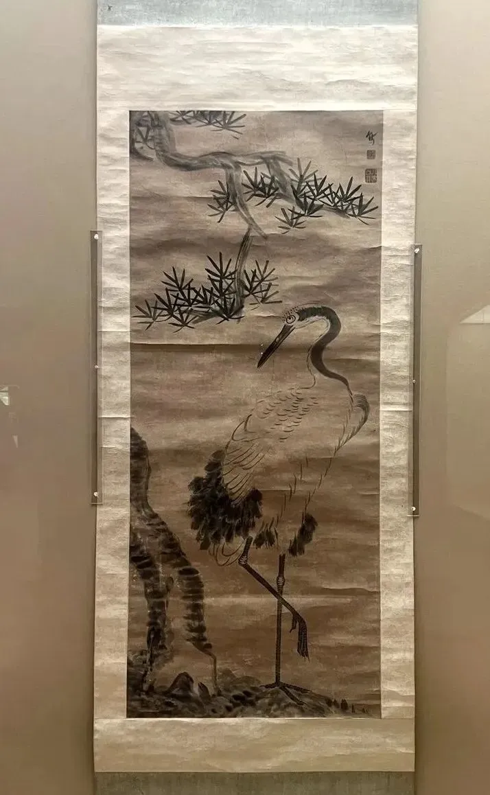 馆内珍藏的《松鹤图轴》 是新春必赏之作。画中松树挺拔苍翠,仙鹤姿态闲适自在,整幅画面呈现出一种和谐安宁的意境。