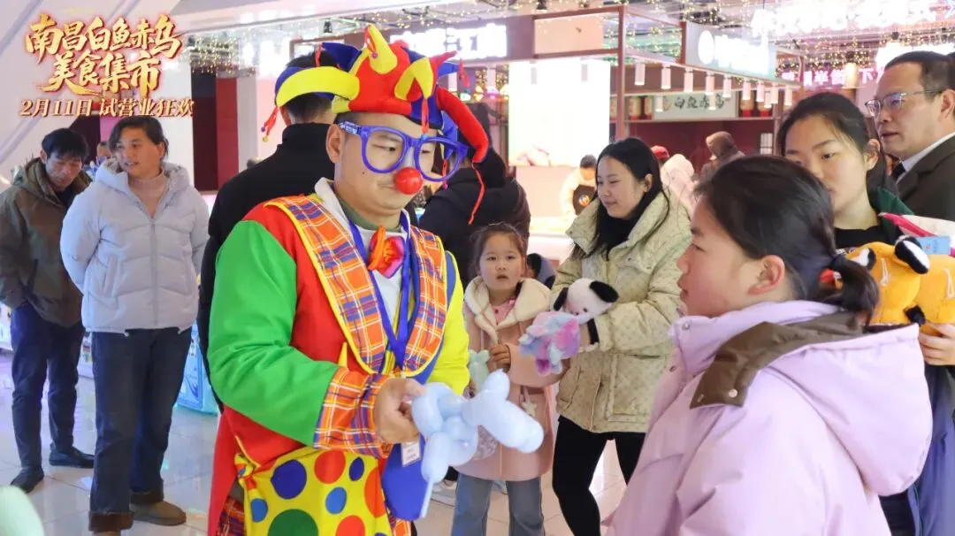 热闹与温暖仍在延续,色彩斑斓的小丑穿梭在人群中,让集市的每一处角落都充满了欢声笑语,成为大小朋友的欢乐天地。