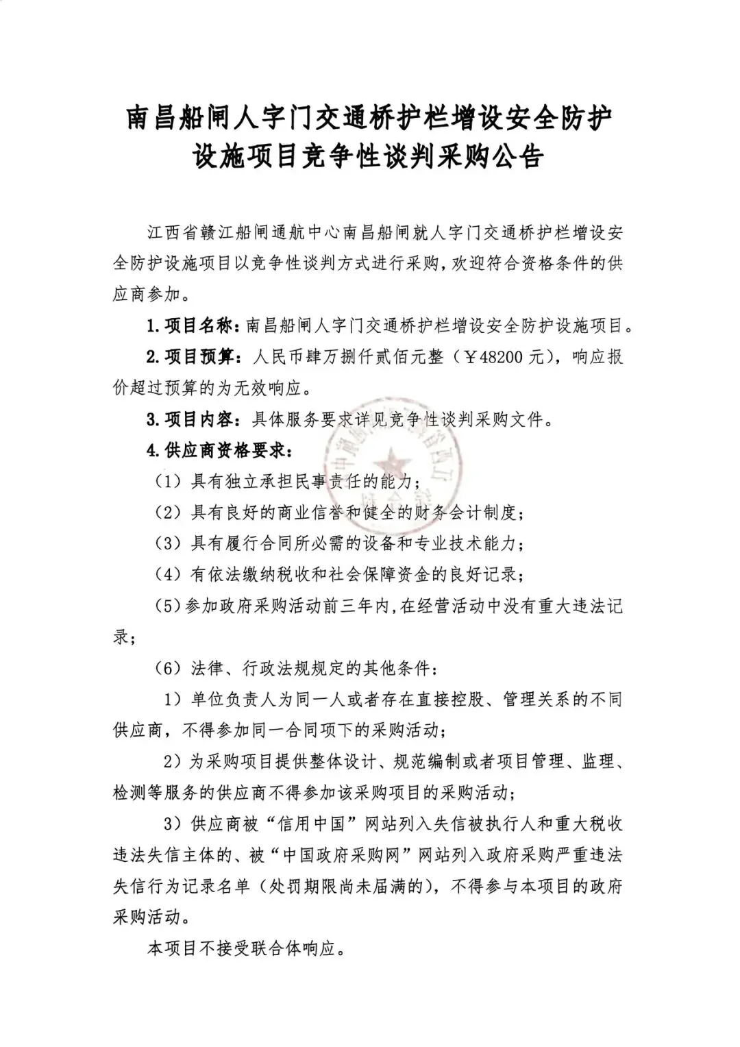 >南昌船闸人字门交通桥护栏增设安全防护设施项目竞争性谈判采购公告